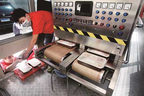 記者在現(xiàn)場(chǎng)看到,這種車是用大巴客車改造的。在大巴車下層放行李的地方有兩臺(tái)發(fā)電機(jī)。而車上全部座椅均被拆除,只剩一臺(tái)帶有兩條傳送帶以及監(jiān)視屏的機(jī)器。工作人員將從冷鏈貨運(yùn)車上搬下來的盒飯放進(jìn)機(jī)器的一頭,隨著監(jiān)視器上數(shù)字不停地變化,微微冒著熱氣的盒飯出現(xiàn)在傳送帶的另一頭。