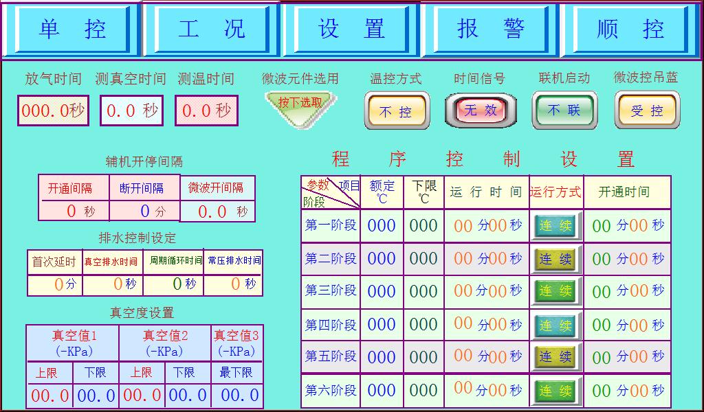 小型微波真空干燥機(jī)控制系統(tǒng)可以手動(dòng)控制也可以自動(dòng)控制,分六個(gè)階段,每個(gè)階段的真空度,溫度,微波功率都可調(diào)。